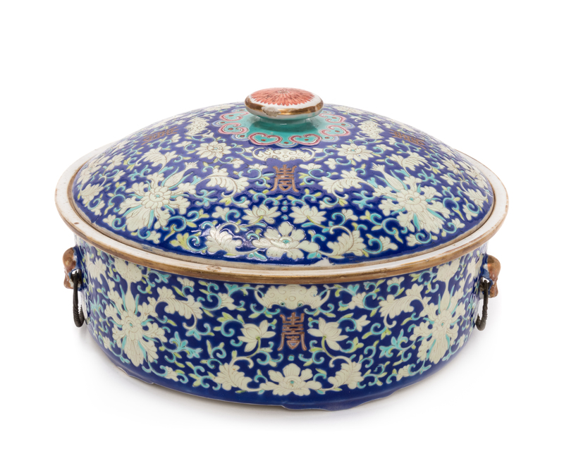 having straight walls, painted to the exterior with gilt decorated shou characters amongst white lotus scrolls, all reserved on a blue ground, flanked by a pair of fu lion mask-form handles with metal rings, the cover surmounted by a chrysanthemum finial.