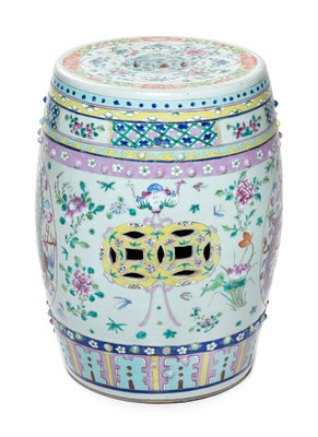 A Chinese Famille Rose Porcelain Garden Stool Height 18 1/4 inches.