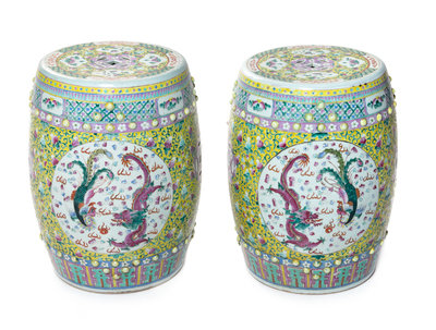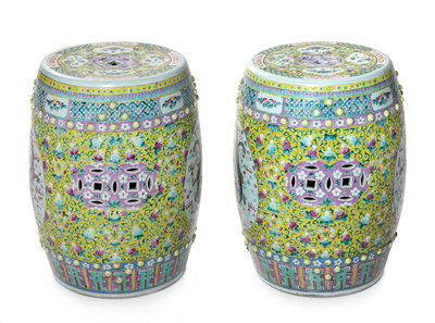 A Pair of Chinese Famille Rose Porcelain Garden Stools Height 19 1/4 inches.