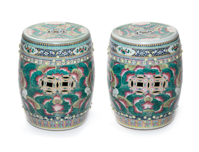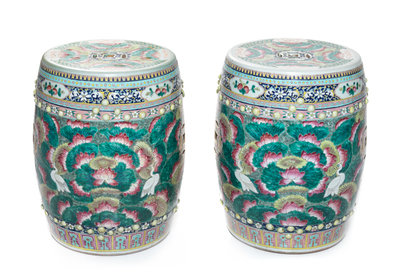 A Pair of Chinese Famille Rose Porcelain Garden Stools Height 18 inches.