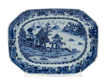 A Chinese Export Blue and White Porcelain Platter Length 12 1/8 inches.
