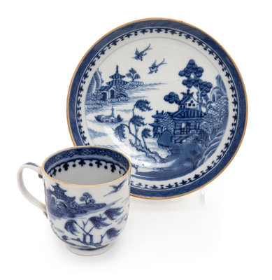 A Chinese Export Canton Blue and White Porcelain Cup and Saucer Diameter of saucer 5 inches.
