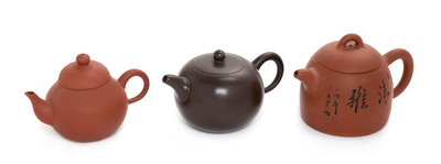 Three Chinese Yixing Pottery Teapots Height of tallest 3 1/2 inches.