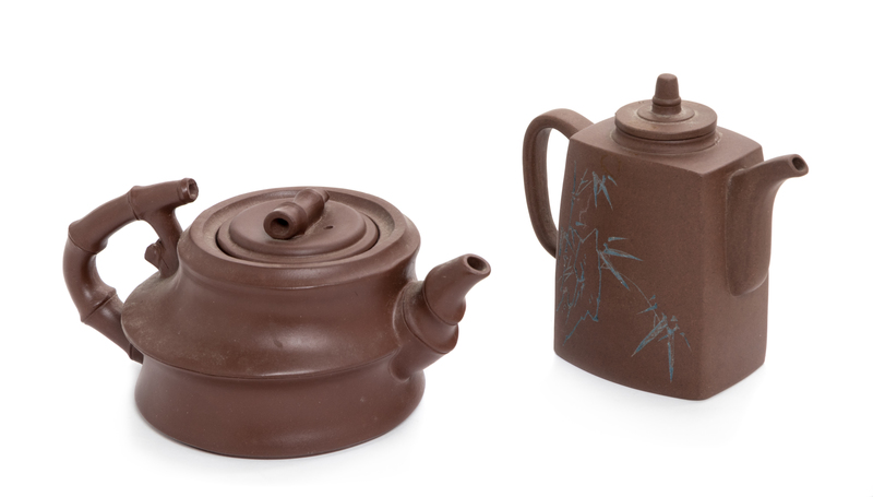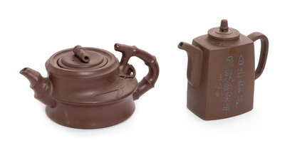 Two Chinese Yixing Pottery Teapots Height of tallest 4 1/8 inches.