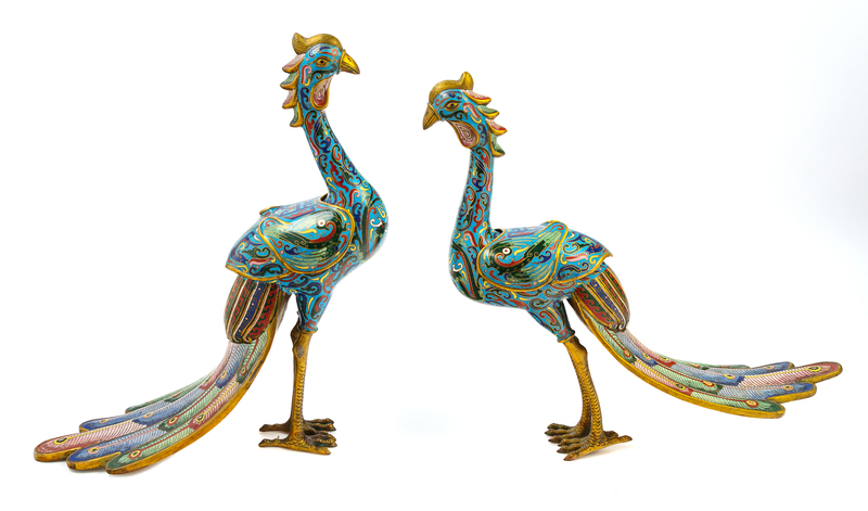 A Pair of Chinese Cloisonne Enamel Figures of Phoenix Height of taller 16 inches.