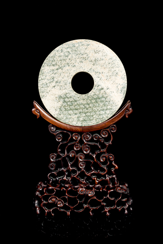 the disk is incised to each side with the whirlpool pattern, the stone of an opaque beige tone with dark green patches, the stand is carved with lingzhi sprays in openwork, the disk does not fit with the stand.