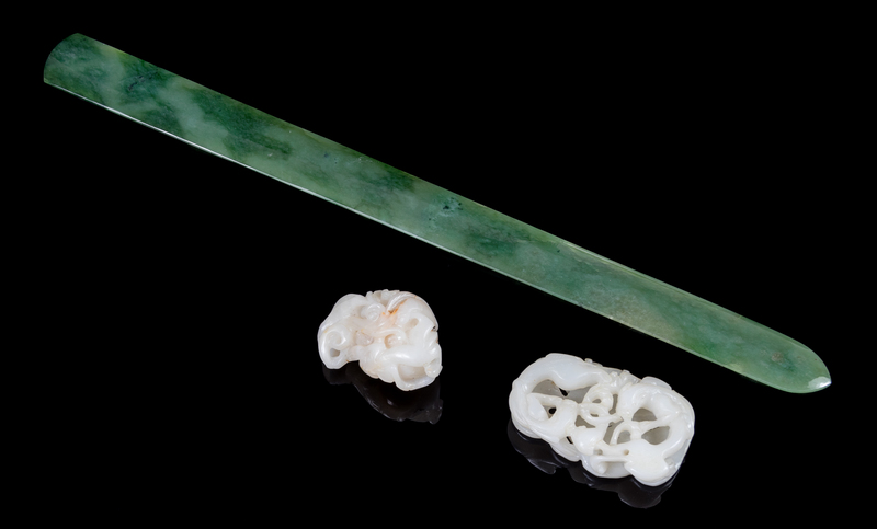 comprising two white jade carvings and a spinach jade page turner.