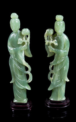 A Pair of Chinese Carved Green Hardstone Figures of Female Immortals Height of figure 11 inches.
