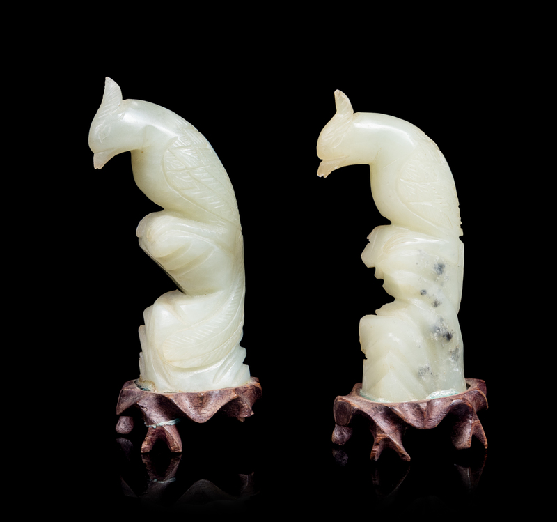 A Pair of Chinese Celadon Jade Pheasants Height 3 1/4 inches.