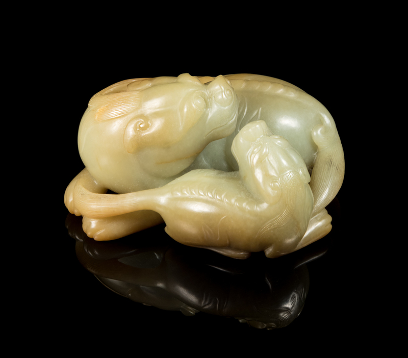 A Chinese Celadon and Russet Jade Carving of Two Mythical Beasts Length 3 3/4 inches.