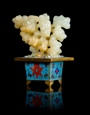 the even colored stone with minor russet areas, carved to imitate scholar's rock, set in a small cloisonne enamel cachpot decorated with lotus scrolls.