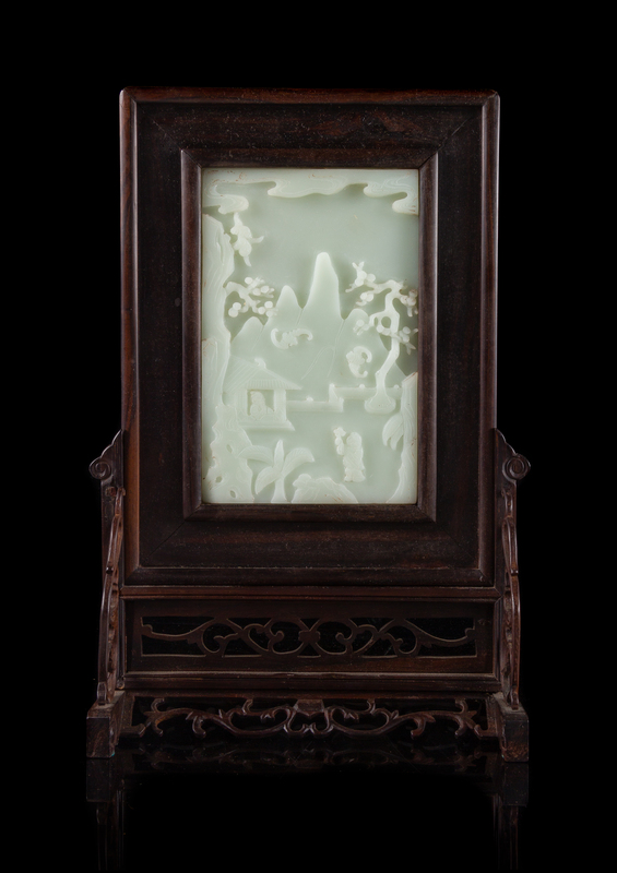 A Chinese Pale Celadon Jade Inset Table Screen Height 14 1/2 inches.
