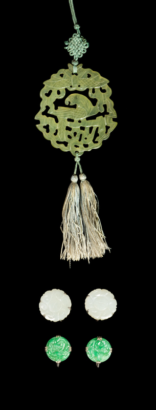 comprising a pair of celadon jade earclips, a pair of jadeite earclips and a serpentine pendant.