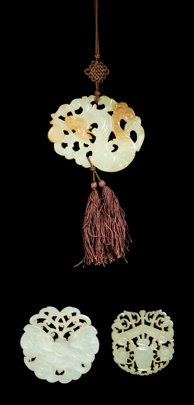 Three Chinese Celadon Jade Pendants Length of largest 2 3/4 inches.