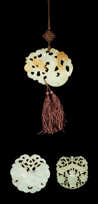 comprising one example carved to show a sinuous dragon, one showing a winged butterfly, one with chime and a flower-filled vase, two mounted as brooches.