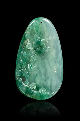 in pear-shaped and carved with a bird, pine trees and peach blossoms, the back is inscribed with a Chinese character reading fu, The stone is of icy white color with intense emerald green.