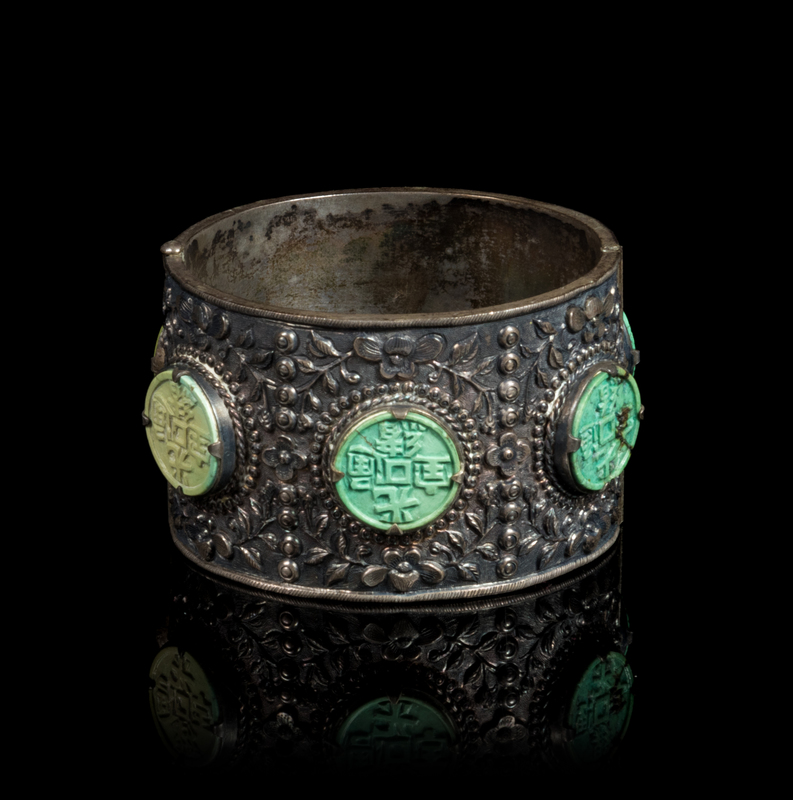 A Chinese Green Plastic Inset Silver Bracelet Diameter 2 1/4 inches.