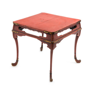 of square form, raised atop four curved legs, with corners and feet terminating in gilt mounts.