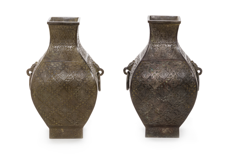 A Pair of Chinese Bronze Taotie Vases, Fanghu Height of each 11 inches.