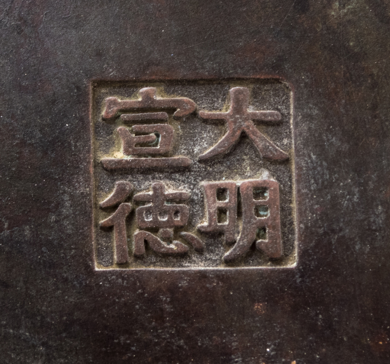 of baluster form, chased with square panels amongst foliate scrolls, flaned by a pair of beast masks and ring handles, the underside bearing an apocryphal Xuande four-character mark within a square panel.