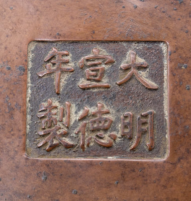 molded in a quatrefoil form, raised on curved feet, flanked by a pair of lion masks, the underside bearing an apocryphal Xuande six-character mark.
