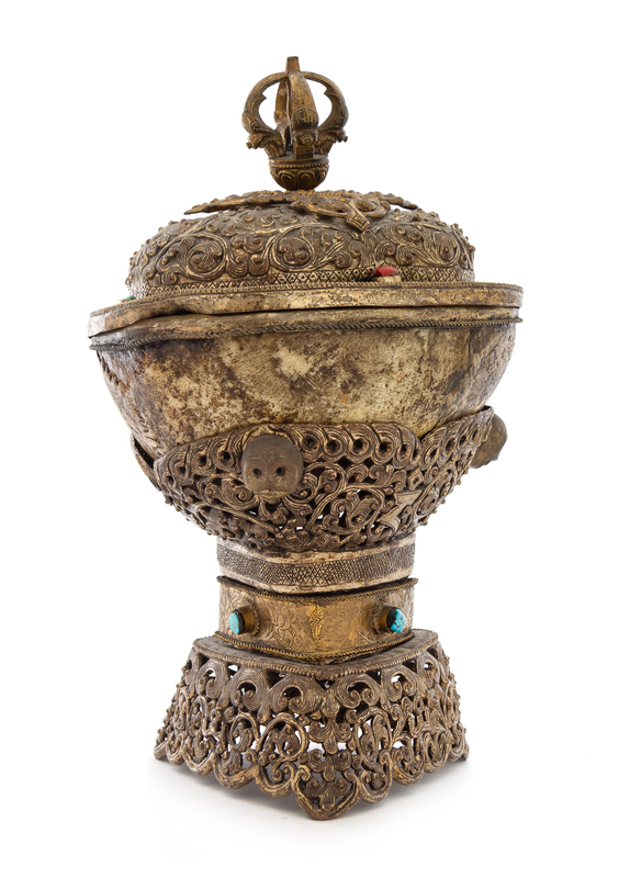 the skull cup mounted with silvered metal lining, surmounted by a domed cover elaborately cast with intricate designs of foliate scrolls, the border with hardstone insets, the knop rising from a double lotus pedestal and shaped as a half vajra, all raised on a tiered stand cast with similar foliate scrolls.