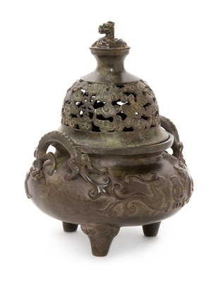 A Chinese Bronze Handled Censer and Cover Height 8 1/2 inches.