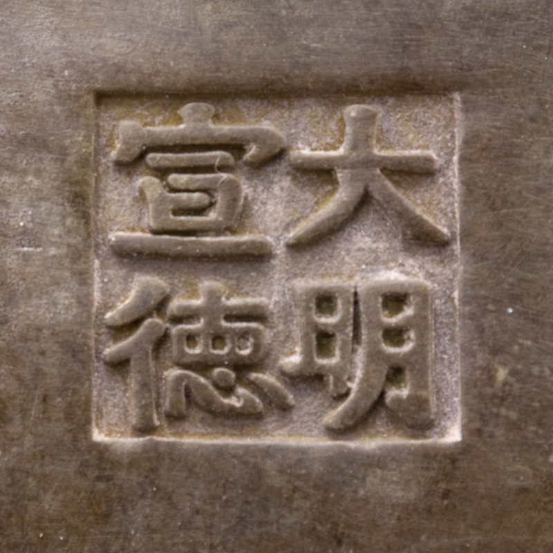 of compressed gobular form raised on ruyi feet, chased with confronting chilongs, the reticulated cover decorated with birds amongst clouds, the underside bearing an apocryphal Xuande four-character mark within a square panel.