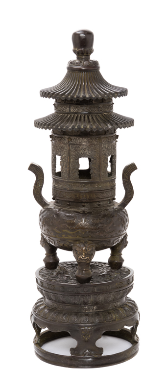 A Chinese Bronze 'Pagoda' Covered Incense Burner Height 19 inches.