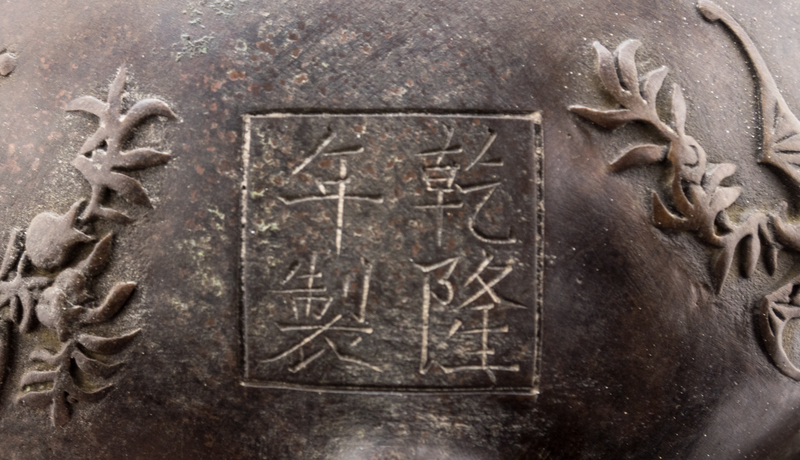 molded in the shape of three joined peaches, two leafy branches forming the upright handles, the cover with openworked leaf motif and a double peach-form finial, the underside incised with an apocryphal Qianlong four-character mark within a square panel.