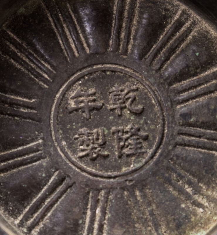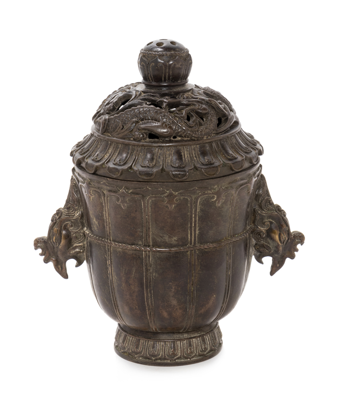 the exterior wall cast with a band of lappet leaves, flanked by a pair of phoenix-head handles, the reticulated cover with dragon decoration surmounted by a lotus bud-form finial, the underside chased with a apocryphal Qianlong four-character mark.