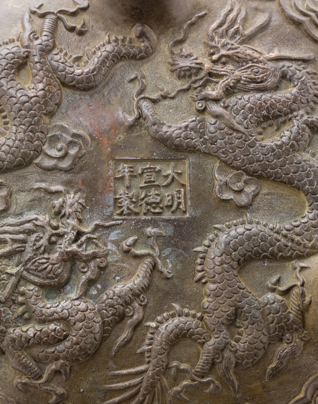 the compressed body chased with dragon decoration, surmounted by a pair of upright handles, the underside bearing an apocryphal Xuande six-character mark.