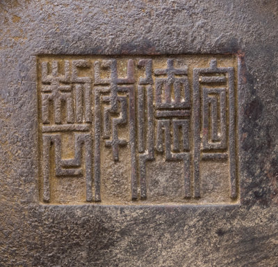 the compressed body flanked by a pair of elephant head-form handles, the underside chased with an apocryphal Xuande four-character mark within a rectangular panel, raised on a matching stand.