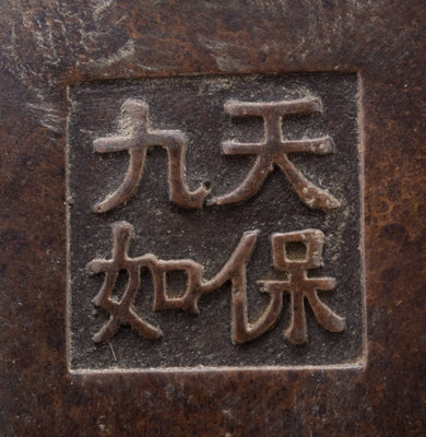 of compressed globular form, having a pair of handles in the shape of peach branches, the underside bearing a four-character mark reading tianbao jiuru.