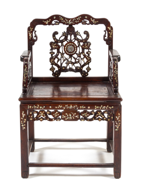 A Chinese Mother-of-Pearl Inlaid Hongmu Armchair, Meiguiyi Height 39 x width 24 3/4 x depth 18 3/8 inches.