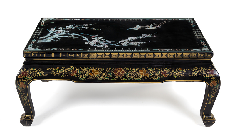 A Chinese Mother-of-Pearl Inlaid Black Lacquered Wood Coffee Table Height 17 3/4 x width 43 x depth 26 inches.