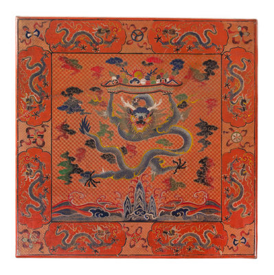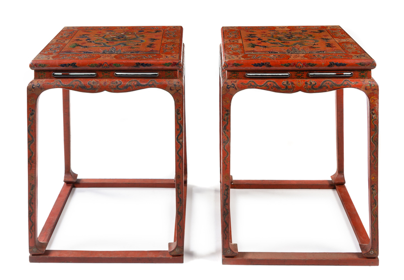 each having a square top carved and painted to show sinuous dragons chasing flaming pearls of wisdom, above shaped aprons with similar decoration, supported on square sectioned legs joined by stretchers.