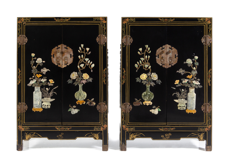 A Pair of Chinese Hardstone Embellished Black Lacquered Hardwood Cabinets Height of each 37 x 25 1/8 x depth 12 inches.