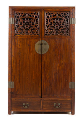 A Large Chinese Elmwood Cabinet Height 80 x width 49 1/8 x depth 22 1/8 inches.