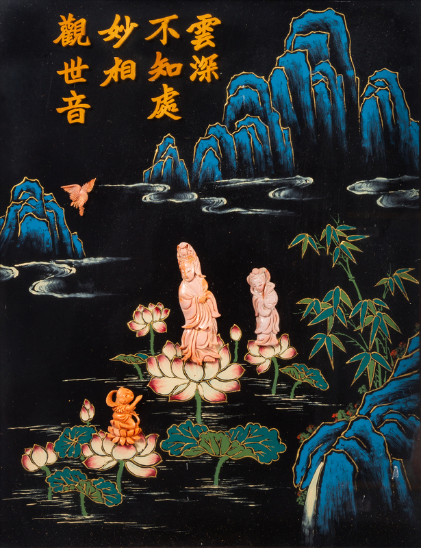 A Chinese Coral and Hardstone Inset Polychrome Painted Black Lacquered Wood Wall Panel Height 20 x width 15 3/4 inches.