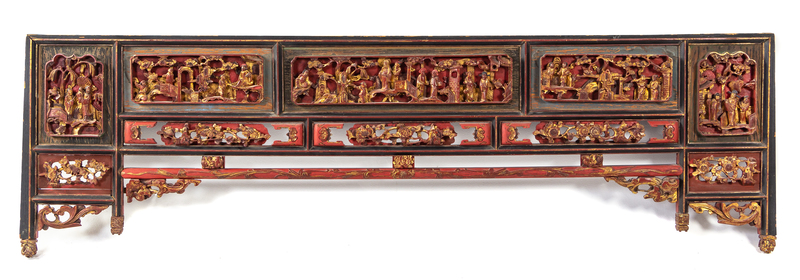 A Chinese Red and Gilt Lacquered Wood Panel Length 79 1/2 inches.