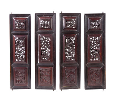 Four Chinese Carved Wood Panels Height of each 17 x width 5 inches.