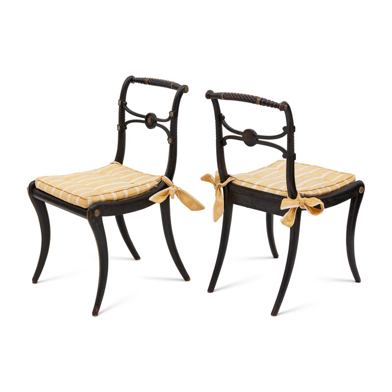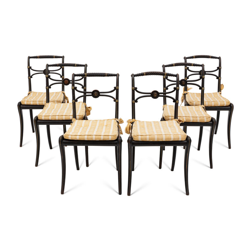 A Suite of Six Regency Ebonized and Caned Dining Chairs