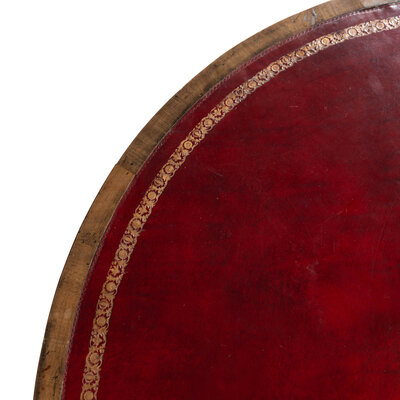 having a circular tooled leather-inset top over a plain frieze set with drawers.