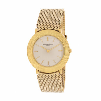 Stamps: Case: (Swiss hallmark). Case back: 18K 0.750 (Swiss hallmark) VACHERON & CONSTANTIN SWISS 6395 391672. Movement: 567435 SEVENTEEN JEWELS 1003. Bracelet: 14K.