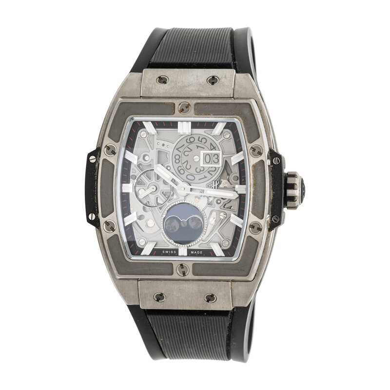 The Hublot Spirit of Big Bang Moonphase Titanium is a 42mm luxury timepiece known for its distinctive tonneau-shaped case and "Art of Fusion" design. This model features a skeletonized dial that reveals the HUB1770 self-winding movement.