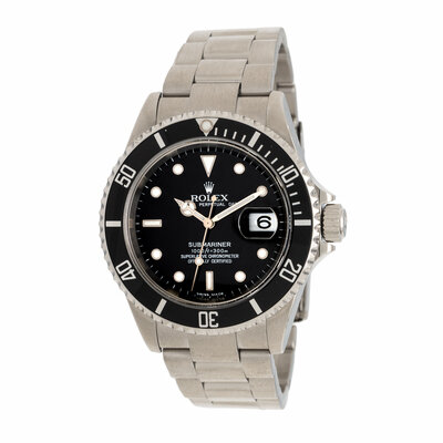 The Rolex Submariner Date Ref. 16610T is a stainless steel diving watch produced between 2003 and 2010. The "T" in the reference number stands for "trous borgnes" (blind holes), indicating that this version features a "no-holes" case, where the lug holes for the spring bars do not pierce through the side of the case.