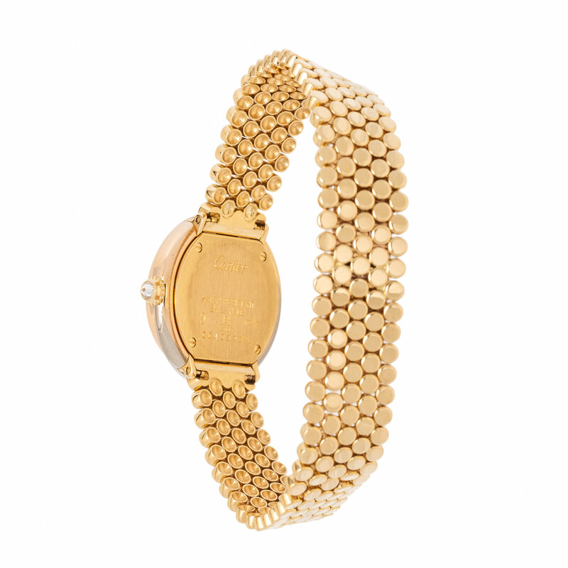 Stamps: Case: Cartier WATER RESISTANT SWISS MADE 18K 750 (Swiss hallmark) 2357 CC408955. Clasp: Cartier SWISS MADE 750 (Swiss hallmarks) 18K.