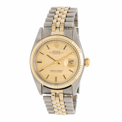 The Rolex Datejust Reference 1601 in stainless steel and 14K yellow gold with a "Linen Dial" is a quintessential vintage timepiece from the 1960s and 1970s. It is highly regarded for its "pie-pan" dial and the distinct cross-hatched texture of the linen finish, which offers a unique play of light compared to standard sunburst dials.