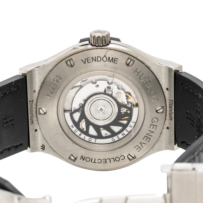 Stamps: Case back: Titanium HUBLOT GENEVE VENDÔME COLLECTION Zirconium 868774. Movement: HUBLOT GENEVE HUB11 SWISS TWENTY-FIVE 25 JEWELS DM11/8343. Clasp: HUBLOT GENEVE STAINLESS STEEL.